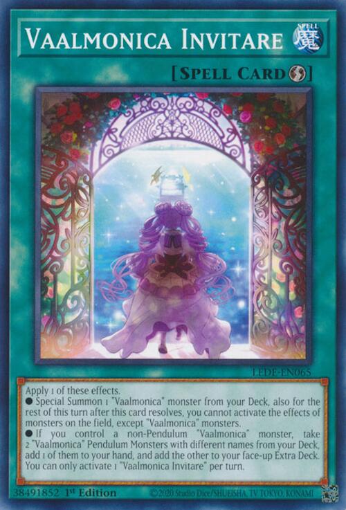 Apply 1 of these effects. • Special Summon 1 "Vaalmonica" monster from your Deck, also for the rest of this turn after this card resolves, you cannot activate the effects of monsters on the field, except "Vaalmonica" monsters. • If you control a non-Pendulum "Vaalmonica" monster, take 2 "Vaalmonica" Pendulum Monsters with different names from your Deck, add 1 of them to your hand, and add the other to your face-up Extra Deck. You can only activate 1 "Vaalmonica Invitare" per turn.