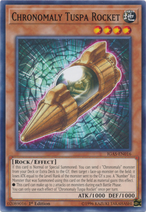 If this card is Normal or Special Summoned: You can send 1 "Chronomaly" monster from your Deck or Extra Deck to the GY, then target 1 face-up monster on the field; it loses ATK equal to the Level/Rank of the monster sent to the GY x 200. A "Number" Xyz Monster that was Summoned using this card on the field as material gains this effect. • This card can make up to 2 attacks on monsters during each Battle Phase. You can only use each effect of "Chronomaly Tuspa Rocket" once per turn.