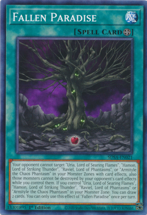 Your opponent cannot target "Uria, Lord of Searing Flames", "Hamon, Lord of Striking Thunder", "Raviel, Lord of Phantasms", or "Armityle the Chaos Phantom" in your Monster Zones with card effects, also those monsters cannot be destroyed by your opponent's card effects while you control them. If you control "Uria, Lord of Searing Flames", "Hamon, Lord of Striking Thunder", "Raviel, Lord of Phantasms" or "Armityle the Chaos Phantom" in your Monster Zone: You can draw 2 cards. You can only use this effect of "Fallen Paradise" once per turn.