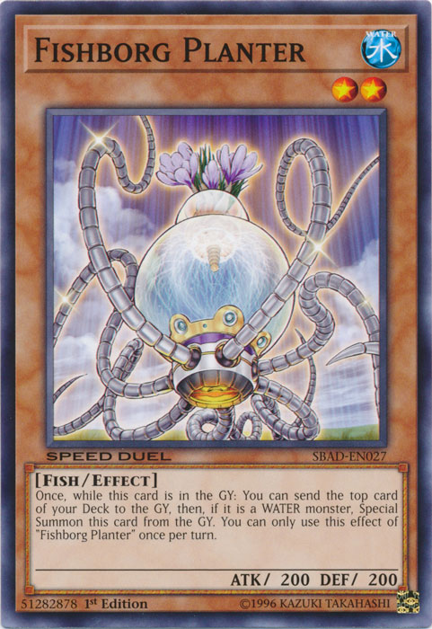 Once, while this card is in the GY: You can send the top card of your Deck to the GY, then, if it is a WATER monster, Special Summon this card from the GY. You can only use this effect of "Fishborg Planter" once per turn.
